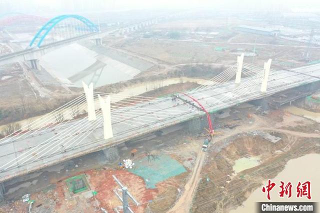 施工人員正在為玉蘭大道橋合龍點澆筑混凝土。