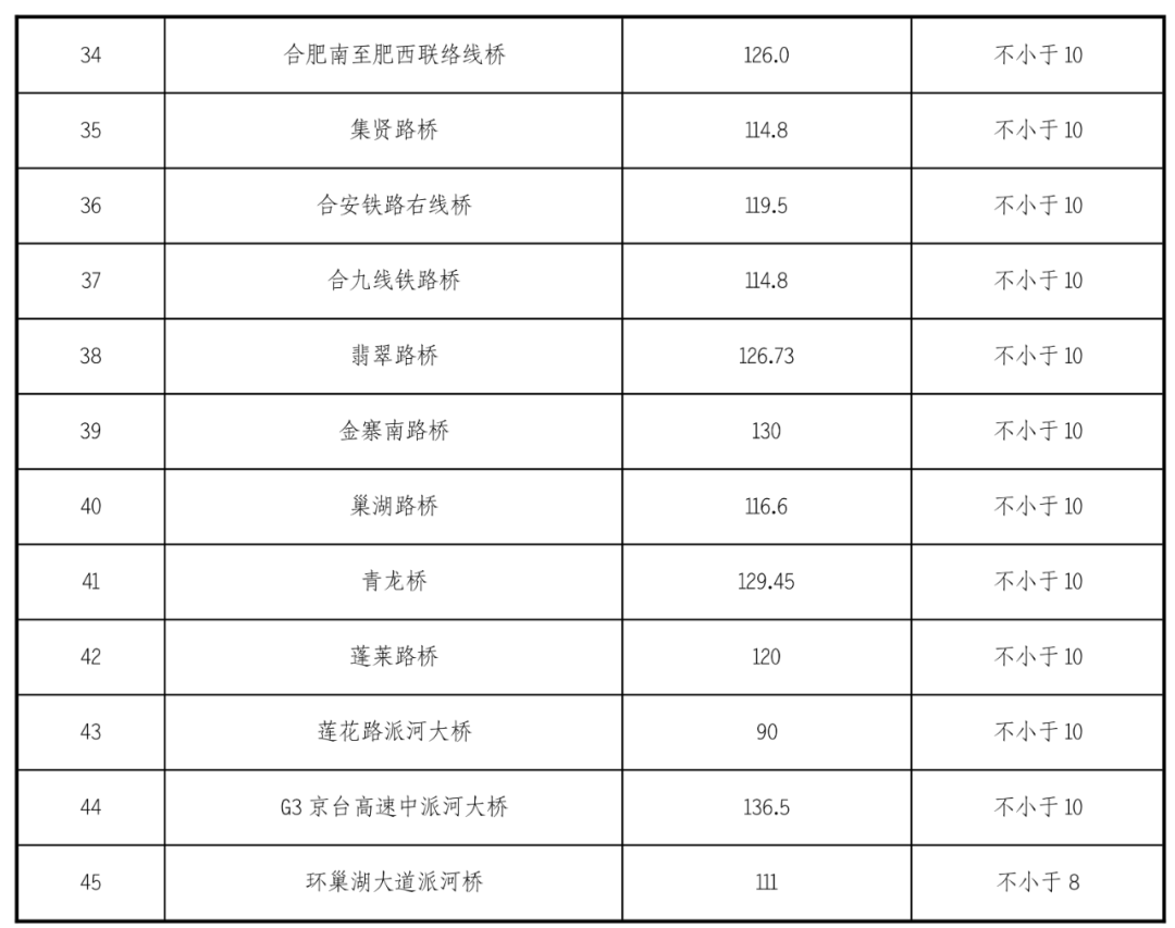 江淮溝通段航道沿線有現(xiàn)狀橋梁45座,橋梁通航凈空尺度參數(shù)見(jiàn)下表:
