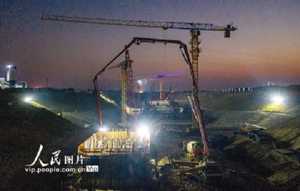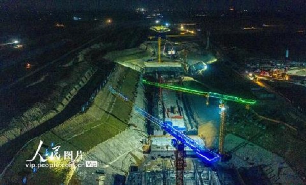 2020年11月15日,引江濟(jì)淮工程安徽省合肥市廬江縣廬城鎮(zhèn)廬江節(jié)制閘施工現(xiàn)場(chǎng),建設(shè)者們正挑燈夜戰(zhàn)加快工程進(jìn)度。