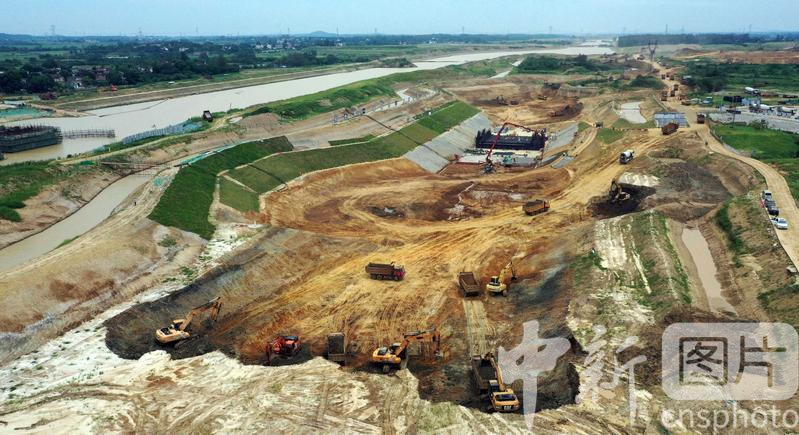 2020年8月7日,航拍引江濟(jì)淮工程安徽省合肥市廬江縣萬(wàn)山鎮(zhèn)永橋村廬江船閘施工現(xiàn)場(chǎng)一片繁忙景象。