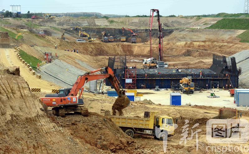 在引江濟(jì)淮工程安徽省合肥市廬江縣萬(wàn)山鎮(zhèn)永橋村廬江船閘施工現(xiàn)場(chǎng),中交第二航務(wù)工程局有限公司的建設(shè)者們用挖掘機(jī)正在緊張施工取土,運(yùn)輸土方工程車(chē)川流不息,船閘底部混凝土澆筑正在施工,建設(shè)現(xiàn)場(chǎng)一片繁忙景象。