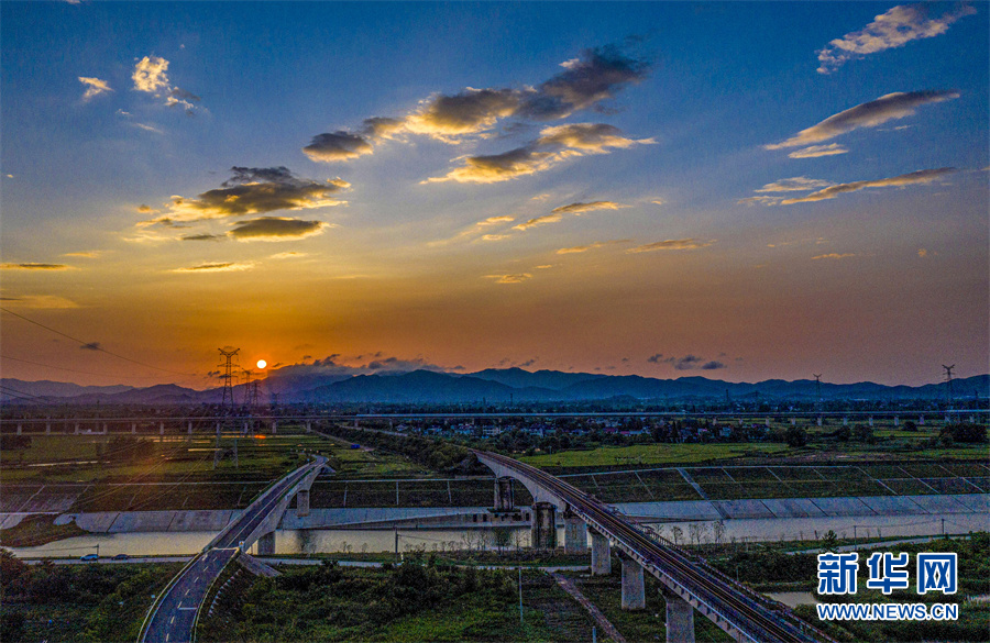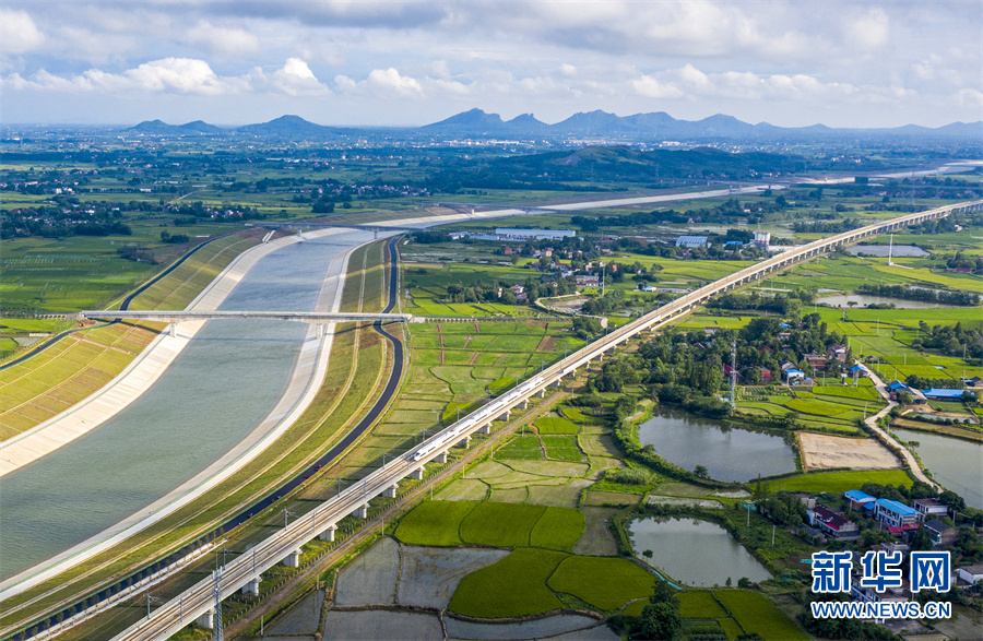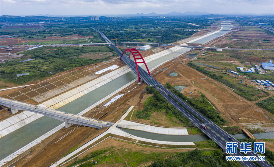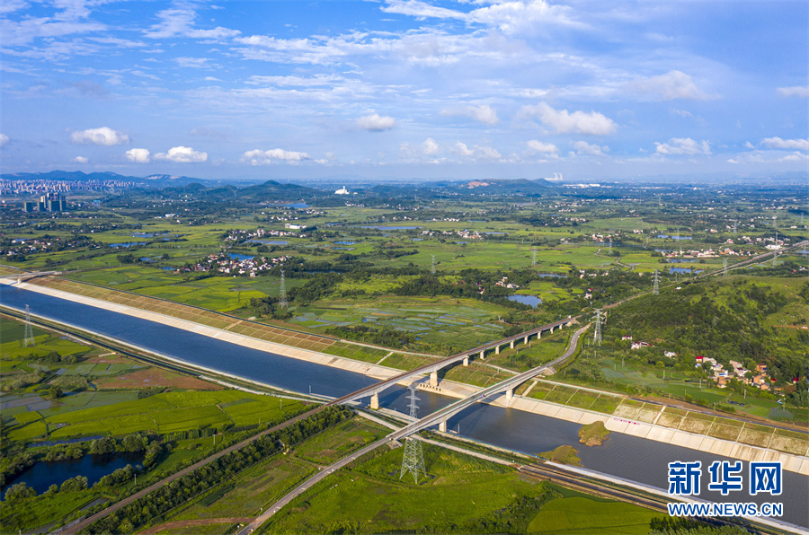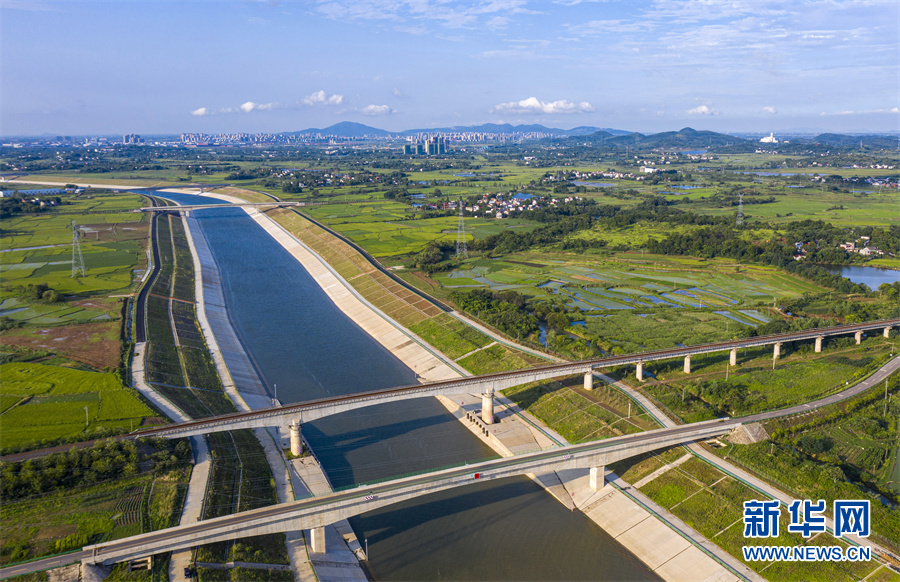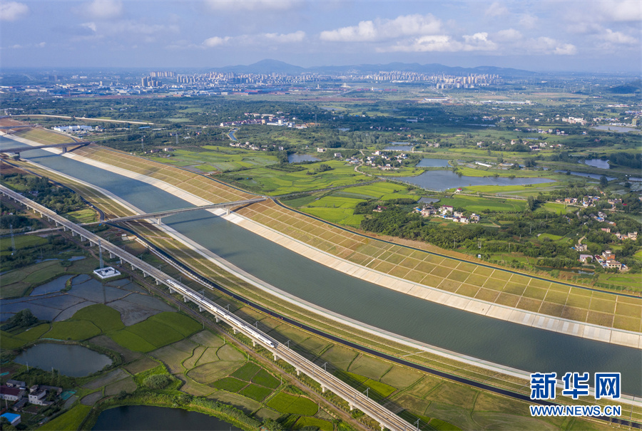 6月28日,安徽省合肥市廬江縣柯坦鎮(zhèn)境內(nèi)的引江濟(jì)淮工程雄姿展現(xiàn),河道、高鐵、公路在綠野中交匯,景美如畫。