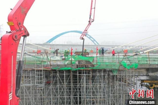 施工人員正在為玉蘭大道橋合龍點澆筑混凝土。