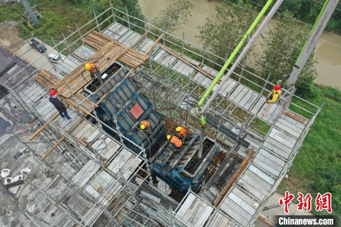 在引江濟(jì)淮工程江淮溝通段玉蘭大道橋主塔封頂施工現(xiàn)場,工作人員正在緊張而有序地施工。 韓翔 攝