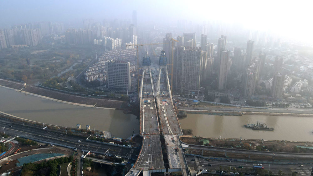↑這是正在進(jìn)行主塔封頂施工的引江濟(jì)淮金寨南路橋(11月24日攝,無人機(jī)照片)。