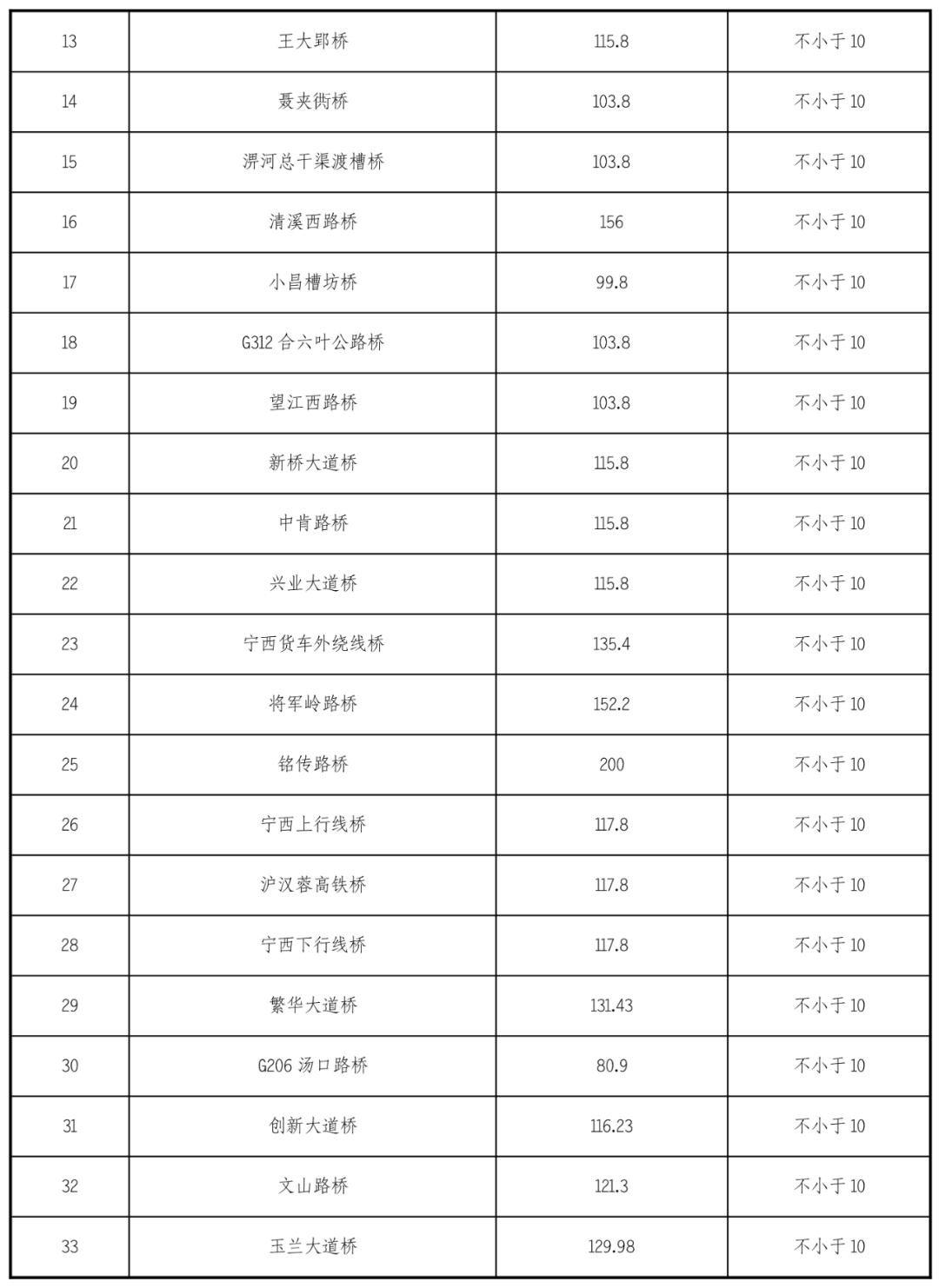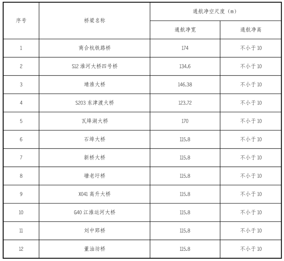 江淮溝通段航道沿線有現(xiàn)狀橋梁45座,橋梁通航凈空尺度參數(shù)見(jiàn)下表: