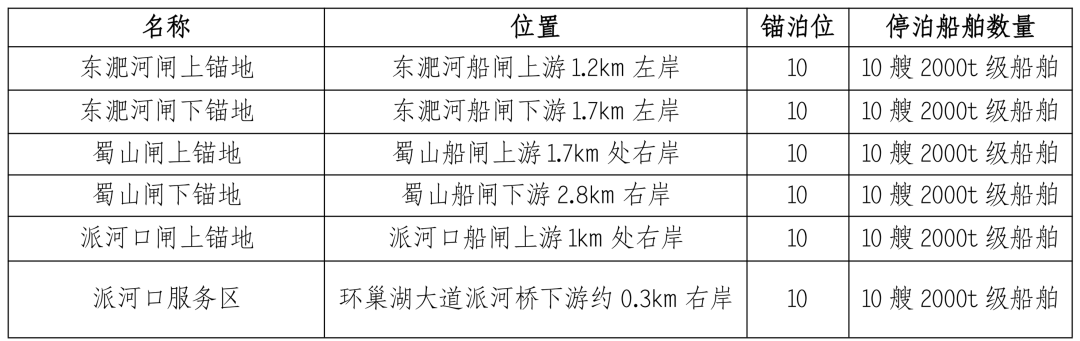 工程沿線建有5個(gè)錨地,分別為東淝河閘上、閘下錨地,蜀山閘上、閘下錨地,派河閘上錨地。
